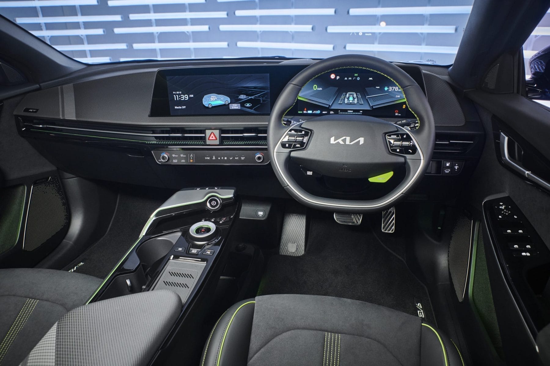 The vehicle’s sporty character is also communicated via a set of five-spoke 21-inch alloy wheels unique to the EV6 GT, while striking neon green brake calipers signal awesome stopping power. At the rear, an aero spoiler, statement LED taillights and a unique bumper complete the GT transformation.